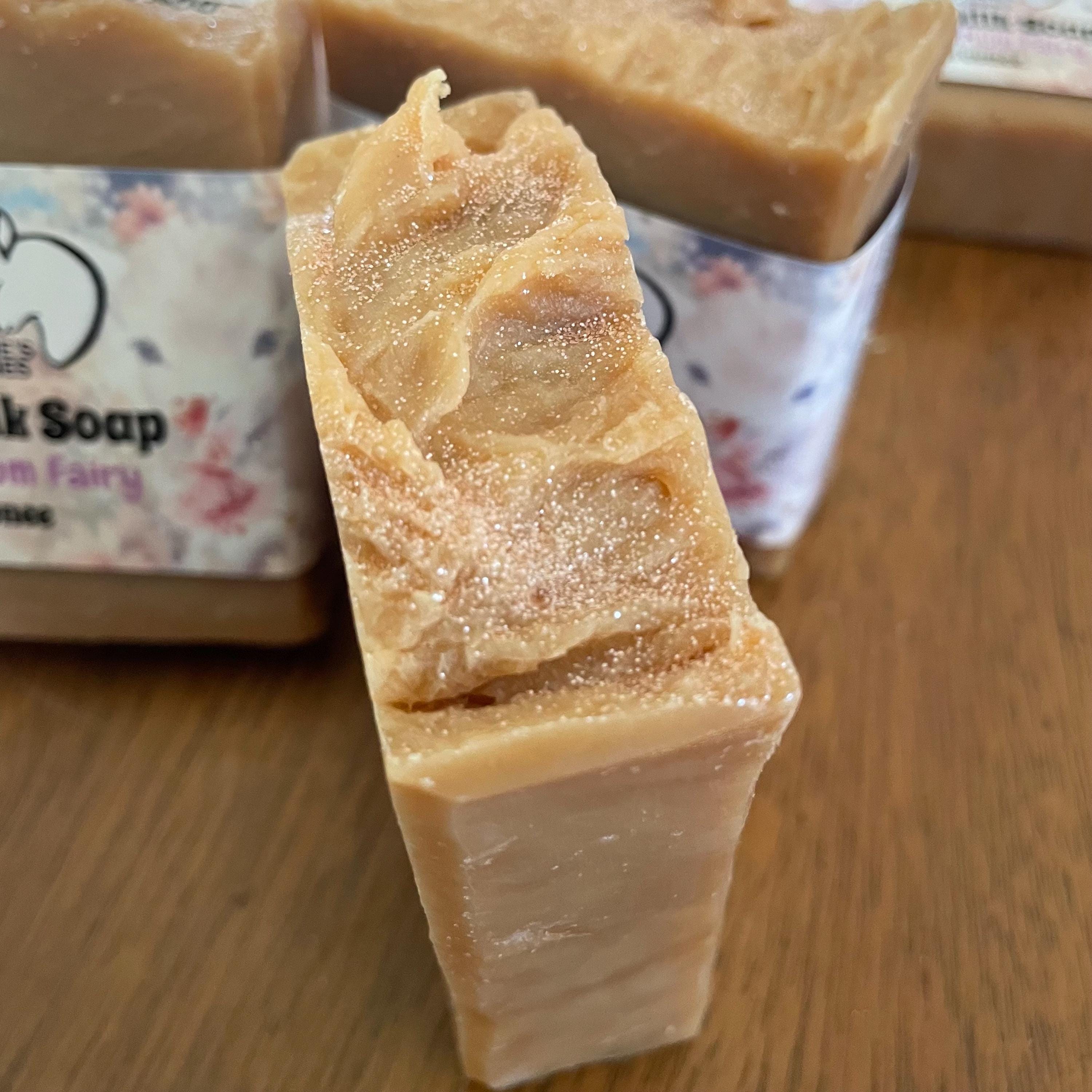 Ingredients: saponified sunflower oil, goat milk, saponified oils of olive fruit, lard, coconut and castor seed, Shea butter, beeswax, Australian pink clay, fragrance