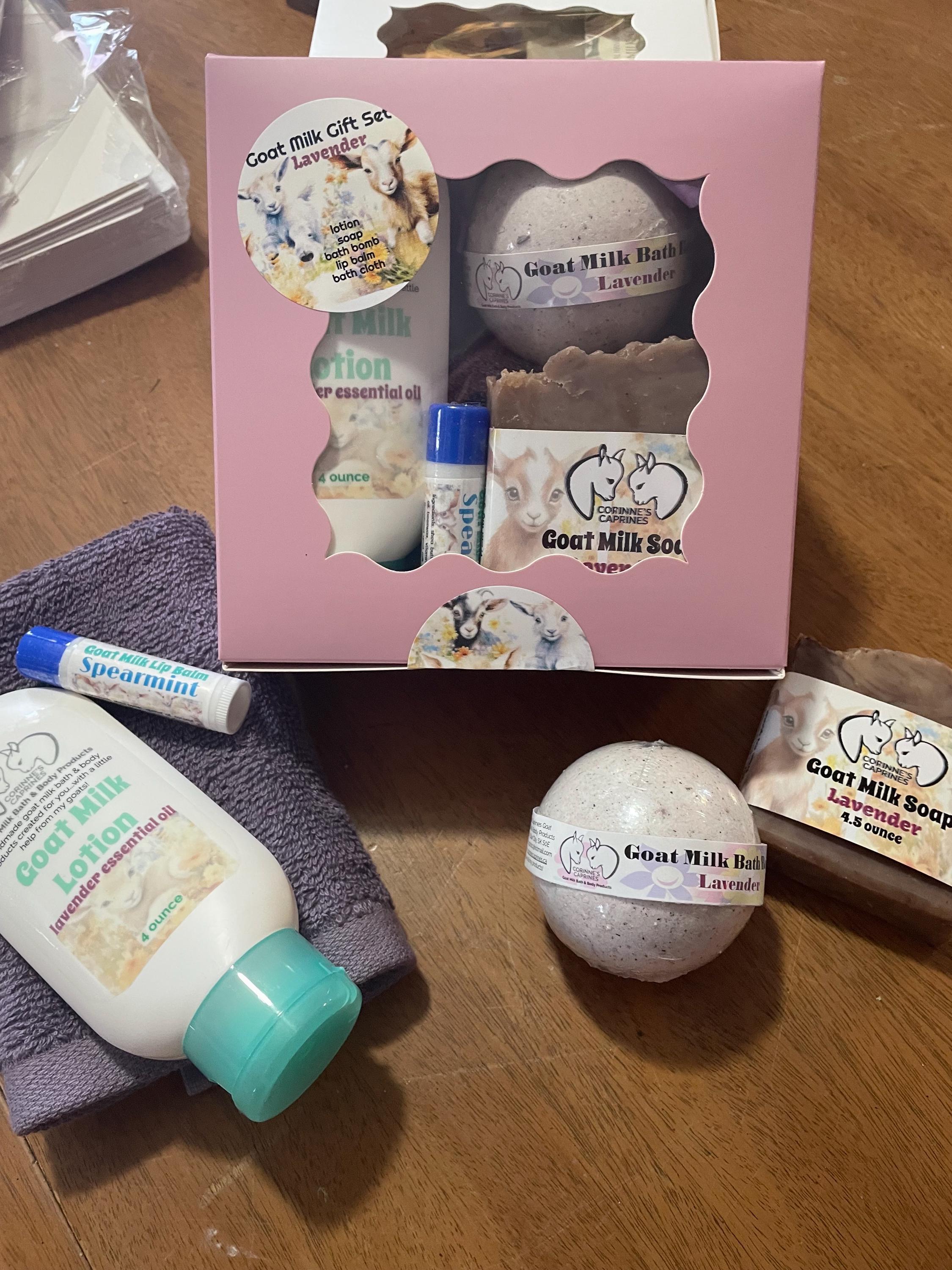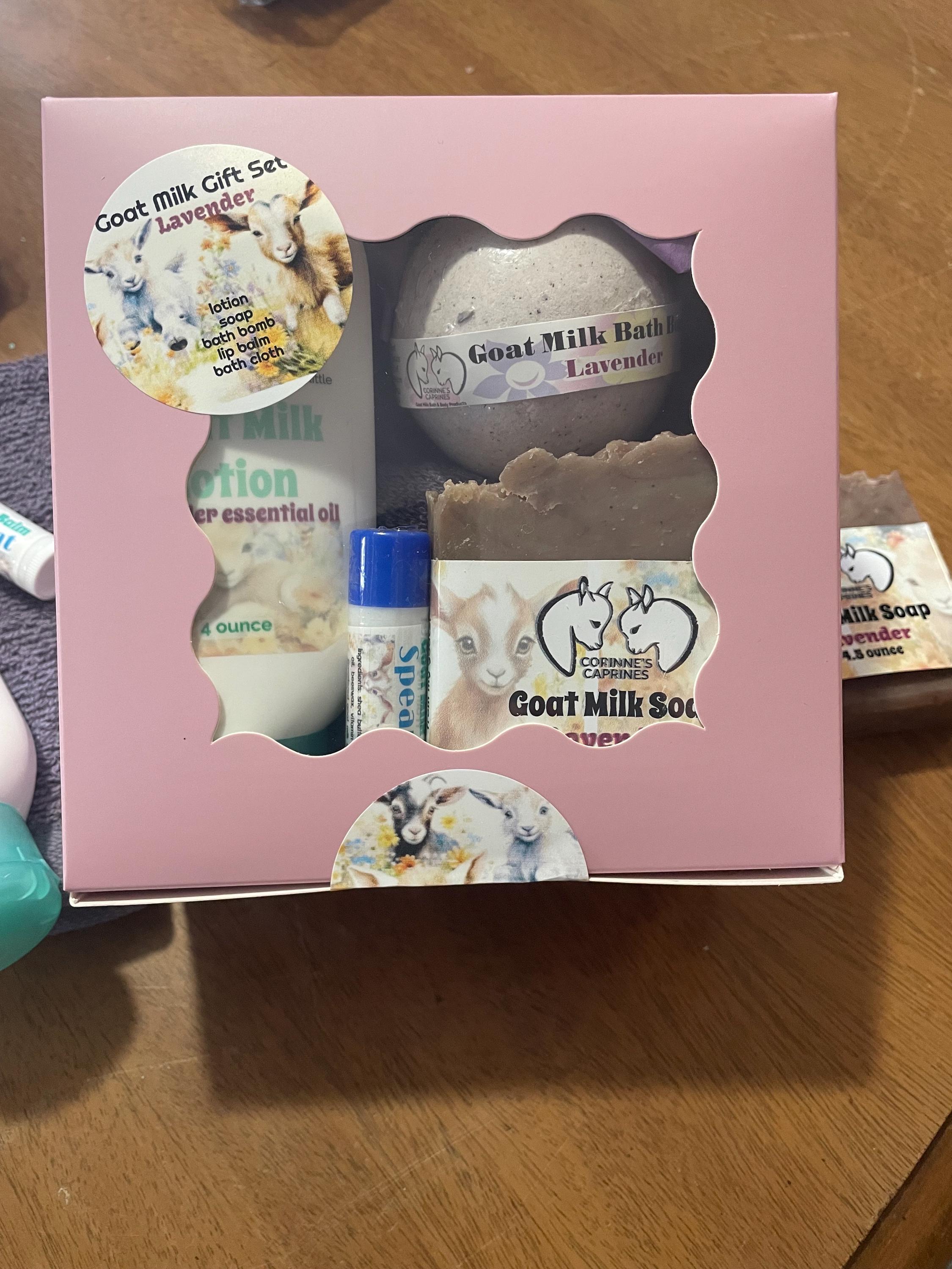 This gift box contains a 4 ounce goat milk lotion, 100 gram goat milk bath or bath bomb, goat milk soap, lip balm and a cotton bath cloth.